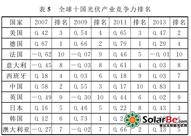 运用同样的方法,计算出2007到2013年十国光伏产业竞争力的排名情况,具体如表5。