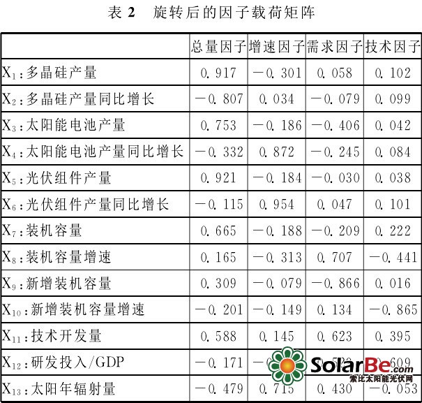 从表2可见,第一公共因子在X1、X3、X5、X7、X9等5个指标上有较大载荷,且指标体系包含了产业链的上中下游,可将其命名为“总量因子”;第二公共因子在X2、X4、X6、X13等4个指标上有较大载荷,代表各国光伏产品的产量增速状况,主要反映了光伏产业增长状况,可将其命名为“增速因子”;第三公共因子在X8、X10等2个指标上有较大的载荷,为装机容量增速和新增装机容量增速,主要反映了光伏产业市场需求变化,可将其命名为需求因子;第四公共因子在X11、X12等2个指标上有较大载荷,主要反映光伏产业创新环境以及技术支撑力,可将其命名为“技术因子”。可以看出,因子命名与之前构建的光伏产业链评价指标体系中的二级指标名称基本吻合,这既可以证明指标体系的科学合理性,也可以说明运用因子分析的可信性。