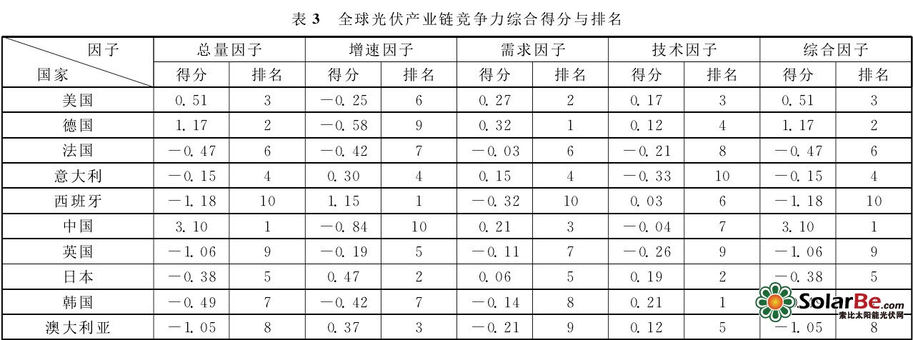 从表3的综合因子看,排在前4的国家的因子分析综合得分均大于0,分别是中国、德国、美国、日本,而其余国家的综合因子得分均小于0,这说明排在前4位的国家的产业链竞争力强,在光伏产业生产环节中处于领先地位,且从数据显示结果来看,处于综合排名第一的中国得分0.864,相比排名第二的德国得分0.326高接近三倍,这说明中国在光伏产业链中处于优势地位,中国太阳能资源丰富,劳动力资源丰富,又有优先的国家政策支持,生产率高,与其他各国相比在生产上占优势。从总体来看,各国皆处于产业链不同阶段,发展程度不同,发展差距较大。