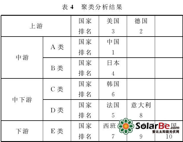 从表4可见,各国在产业链分别处于哪一环节,美国、德国处于产业链上游,美国作为经济实力强国,科技发达,多晶硅生产需一定技术支持;德国作为欧洲地区较早发展光伏产业的国家,光伏生产技术先进,处于产业链上游环节。中游根据所处阶段不同,分为两类:A类和B类,中国处于产业链中游A类,中国作为光伏产业新兴国家,光伏产业发展迅速;同时作为第一人口大国,劳动力资源丰富,在劳动力密集型的中游的太阳能电池生产、光伏组件生产上占据较大优势。日本处于中游B类,相比中国,日本近几年光伏产业发展更为迅速,日本已成为中国光伏组件最大出口国。处于中下游的是韩国、法国、意大利,中下游也划分为两类:C类和D类,韩国处于C类,相比法国和意大利,韩国光伏产业起步较晚,但现如今光伏产业发展较快,光伏产业发展蒸蒸日上。处于产业链下游的是西班牙、澳大利亚、英国,作为较早发展光伏产业的国家,较早掌握了光伏系统发电的技术,但近几年发展速度放缓。从太阳能光伏产业链上游到下游,市场结构上呈现由垄断到竞争的特点,技术结构上呈现由核心技术到一般技术的特点,这两个特点共同促成利润率在产业链上分布的特点是从上游到下游递减的规律。