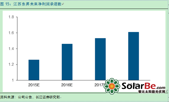 3、增发收购组件产能,完善产业链布局。近期协鑫集成发布公告,拟1元/股向实际控制人家族企业发行股票20.2亿股,用于收购江苏东昇及张家港其辰100%股权;并拟增发不超过5亿股,募集6亿元配套资金。江苏东昇具备1GW组件产能,张家港其辰1GW组件产能试生产,1GW产能在建,预计年底投产,其子公司徐州其辰具备1GW产能在建,预计2016年投产。