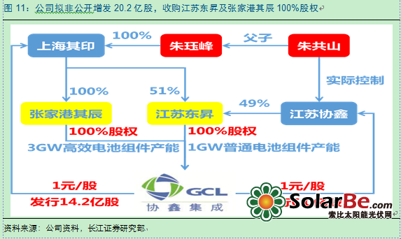 2015年6月3日,协鑫集成发布公告,公司拟以1元/股的价格,非公开发行股票20.2亿股,用于收购江苏东昇及张家港其辰100%股权,其中: