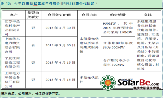 随着生产逐步恢复以及公司电站集成业务逐步推广,目前公司与多家企业签订系统集成《战略合作协议》和组件销售合同,我们预计公司2015年系统集成及组件销售规模将超过2GW,为公司业绩增长打下坚实基础。