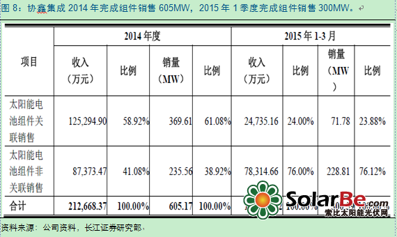 2014年公司实现组件销售605MW,其中关联销售370MW,占比61%;2015年1季度公司成组件销售300MW,其中关联销售72MW,占比24%。