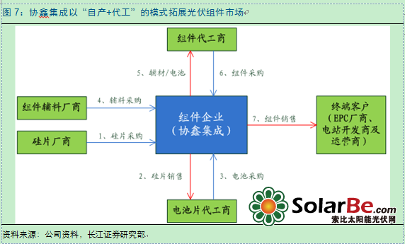 2、定位系统集成龙头,规模驱动利润扩张。协鑫集成主要定位组件生产及光伏电站系统集成、金融和运维服务等方向:1)以“自产+代工”的模式进行组件销售。目前公司已恢复组件生产,2014年实现销售605MW,其中关联销售370MW,占比61%;2015年1季度公司完成组件销售300MW,其中关联销售72MW,占比24%;2)系统集成+运维服务+金融服务的集成包业务。公司通过布局鑫阳光、收购江苏佳讯、设立协鑫阳光金融等,实现专业化、差异化的系统集成包业务,利用技术优势、产业资源优势,实现规模与利润规模。江苏协鑫重组时承诺,公司2015、2016年归属母公司净利润不低于6、8亿元,结合公司集成包业务订单情况,完成概率较大。