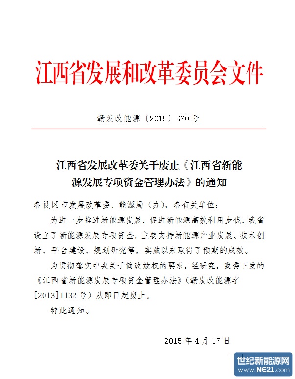 根据通知指示:为贯彻落实中央关于简政放权的要求,经研究,江西省下发的《江西省新能源发展专项资金管理办法》(赣发改能源字[2013]1132号)从即日起(2015年4月17日)废止。