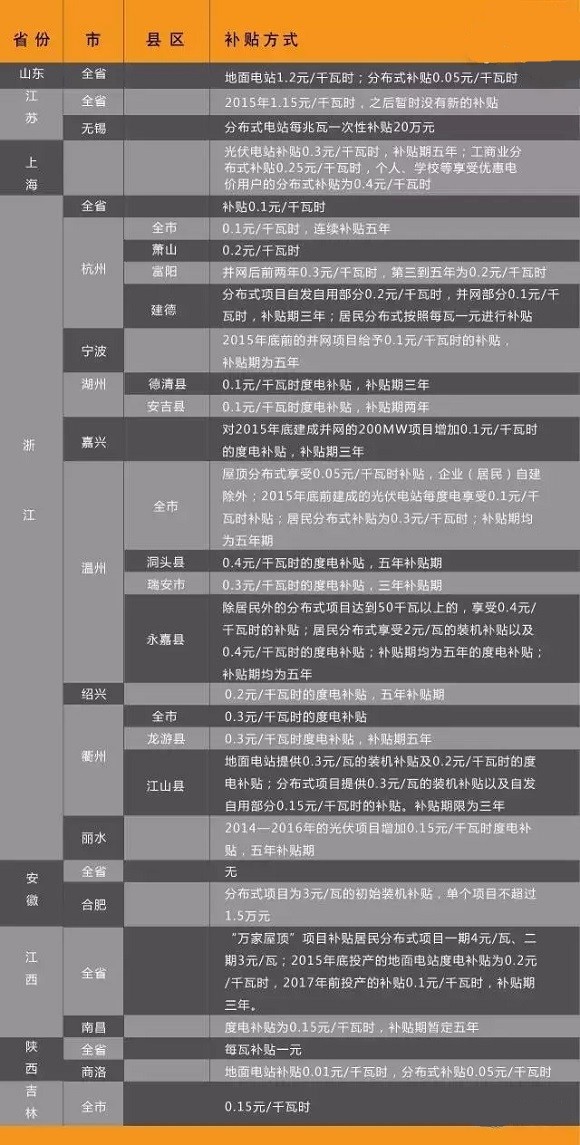 从国家能源局此前发布的2015年上半年光伏发电建设信息简况来看,出台地方补贴的地区往往电站投资动力更强。以分布式为例,浙江新增200MW、江苏新增150MW、山东新增120MW、江西新增60MW、上海新增50MW,这些分布式装机量大的区域基本都有地方补贴,地方补贴成为了推动分布式发电的强劲动力。