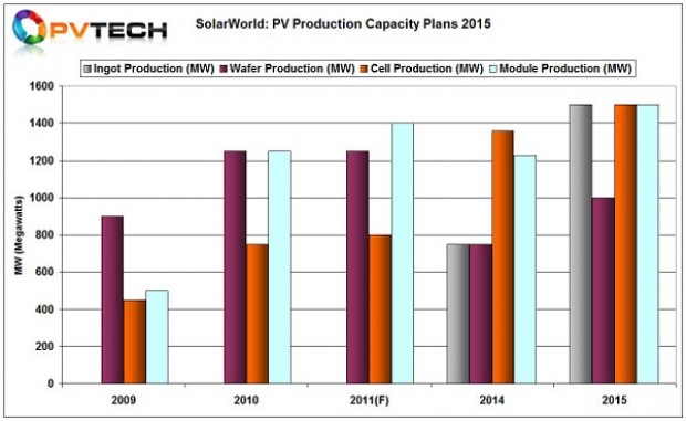 SolarWorld在2015年有望将组件产量提高270MW达到1.5GW的额定产量。预计同期太阳能电池产量将提高140MW至1.5GW。随着在前博世(Bosch)工厂重启单晶硅锭生产,该集团硅锭总产量将翻倍至1.5GW。