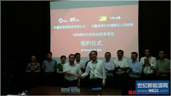 8月18日,宿州市埇桥区人民政府与苏州协鑫新能源控股有限公司宿州埇桥140MW光伏电站项目签约仪式在苏州协鑫集团总部隆重举行,区委副书记、区长刘博夫,区委常委、区纪委书记陈殿魁,区委常委、副区长吴绪峰,副区长李云英,区国土局、招商局等单位负责人以及协鑫新能源控股公司相关负责人出席了签约仪式。