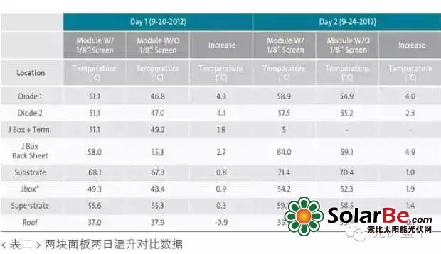 依据 UL 1703 标准,将相同的两块光伏面板安装在模拟屋顶的木板上,其中一块四周都安装上开孔为 1/8 的滤网,另外一块则无任何处理,此时将两块面板都接通电路并使之处于正常使用状态两日后,通过对比实验和记录可显著发现:安装滤网的光伏面板的底板和二极管之温升皆比没有安装面板高出 3-5℃(如< 表二>)。由此可见滤网的安装对散热势必有不利影响,特别是在夏天环境温度较高的情况下,前述的 3-5℃ 温差也许就成了对象会否达到可燃物燃点的关键。