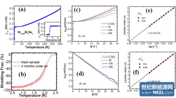 (a) SrxBi2Se3单晶体的超导转变;(b) 样品的超导体积分数;(c)和(d) 利用稳态强磁场水冷磁体装置测量得到的样品的量子振荡;(e)和(f) 通过对量子振荡数据进行分析,得到反映拓扑表面态的证据:朗道指数和1/B的截距接近0.5。