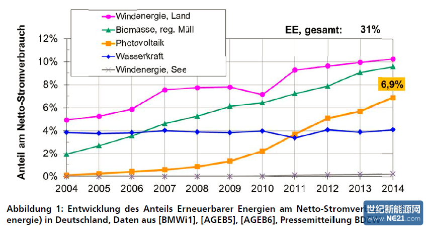 从德国来讲,可再生能源的发展从2000年德国能源转型启动以来发展得比较好,风电的总发电量占全国电力消费总量已经超过10%左右了,光伏发电的比例也达到了6.9%。