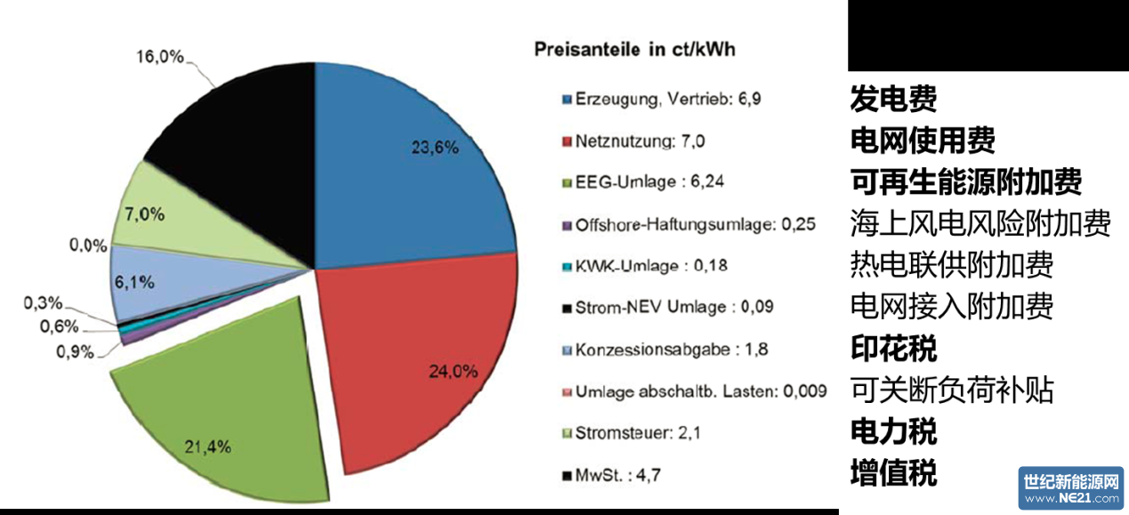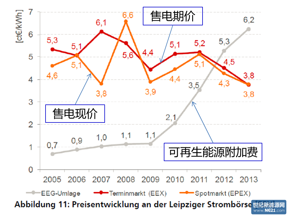 德国现在的电力市场平均交易电价现在只有约3.8欧分,也就是2.8毛或3毛钱,比现在中国的煤电平均上网电价还要低,基本上相当于新疆煤电的水平。但是可再生能源附加费,附加在电力用户的每一千瓦时的电费上升到了6.2欧分,也就是说发电的市场交易价比可再生能源附加费还要低。
