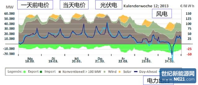 从下面这张图上就可以看出,风光电出力大的时候,电力市场的售电价格就会下降。2013年3月24日(周日,用电负荷较低)的白天,在光伏发电的高峰,电价甚至成为负的。这就意味着,光伏发电出力越大,赔得就越多。