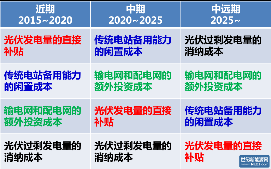 除了对光伏发电的直接补贴成本,还有三项补贴成本在初期的时候很容易被大家忽视,但是和相对固定的补贴不同的是,其它三项补贴成本的金额会随着时间的推移,在光伏发电功率的比例越来越高时,会越来越多。
