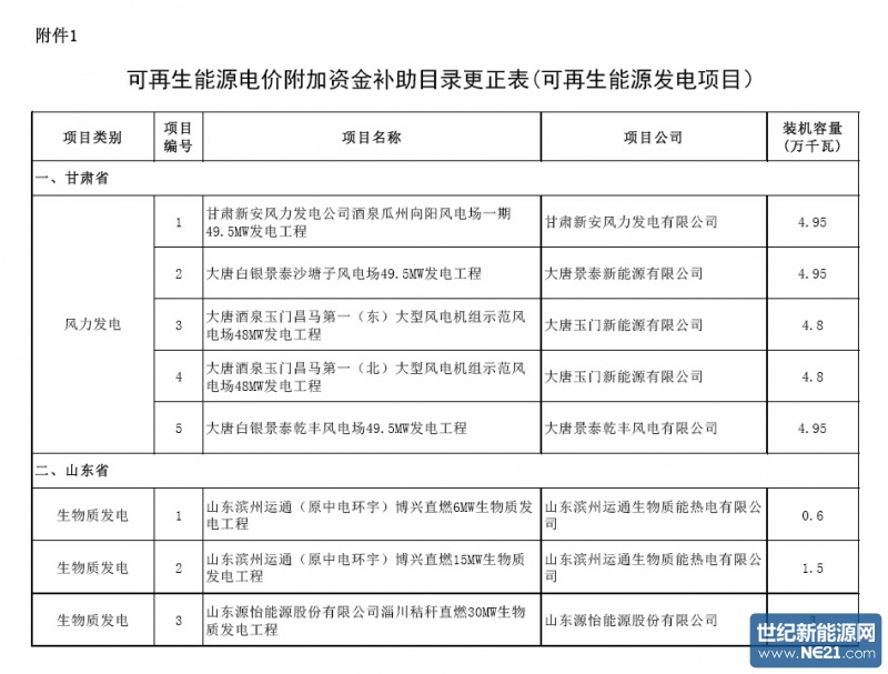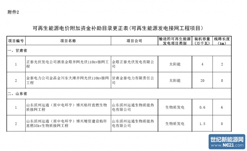 财政部、发改委、能源局《关于调整可再生能源电价附加补助目录 部分项目信息的通知》