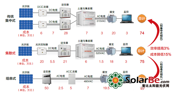 2014年开始,集散式逆变器开始崭露头角。集散式逆变器通过提供一体化解决方案,既可以多路MPPT精准跟踪,又能保证电能质量;同时,通过在控制器(汇流箱)侧对电压的提升,大大降低了光伏电站内数量最大的直流电缆的线损。多路MPPT精准跟踪、直流线损降低、投资与集中式基本相同。因此,相对于最初的集中式,由于集散式逆变器的发电量提高而投资基本不大,度电成本肯定会较大幅度降低。