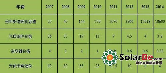 综上所述,由于关键设备技术提高、规模化效应、设计水平不断提升等原因,光伏电站的造价不断下降。下表为2007年~2014年,光伏电站造价的变化情况。