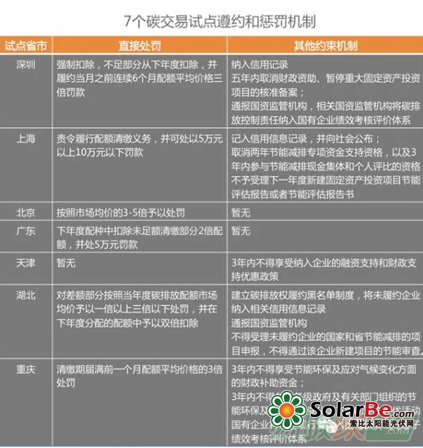 7个碳交易试点都制定了严格的惩罚措施,除了规定高昂的罚款金额外,不少试点都要求没有完成减排目标的主体第二年进行弥补,弥补的程度各不相同。这样做的目的是为了避免企业逃避责任,影响总量控制的目标。同时,在每年规定期限前,排放主体必须将该年经核证的二氧化碳排放量与其拥有的排放权进行结算,结算后注销。超额排放的排放主体可以到市场上购买不足的排放权,否则将受到惩罚,罚款金额高于市场购买排放权的成本,同时上一年未完成的减排量要加入第二年的减排目标中。