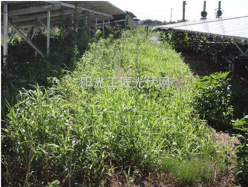 除草的效果一目了然:在附近那些有杂草生长的光伏电站内,禾本科的细长形草叶和粗梗的菊科杂草长到了数十cm高,顶上有花蕾或开花结籽(图4)。而“久兵卫2号发电站”内完全看不到高草(图5)。