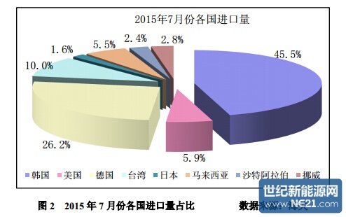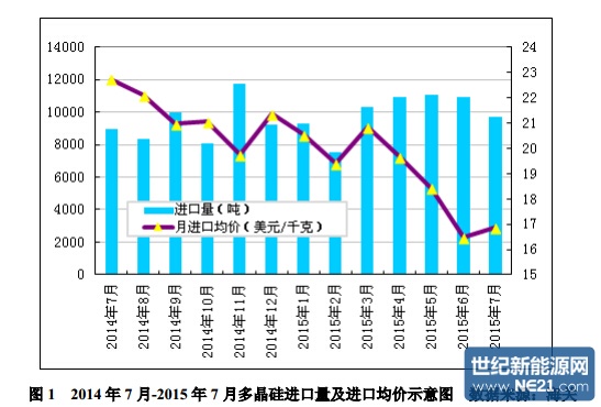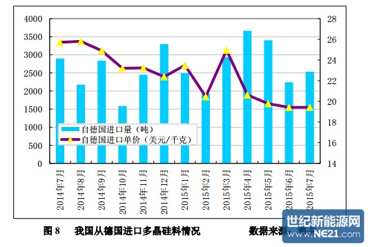 2015 年 1-7 月份累计从德国进口多晶硅量为 19194 吨,同比增幅为 7.3%; 1-7 月份累计进口均价为 21.19 美元/千克,同比降幅为 8.7%。