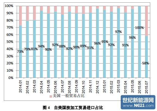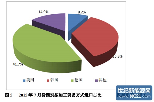 二、按贸易方式来分,2015 年 7 月份我国加工贸易等方式进口 4036 吨, 占比为 41.8%。1-7 月份累计按加工贸易方式进口 40259 吨,占累计总进口量的 57.7%。分国别具体看来:7 月份自韩国按加工贸易方式进口多晶硅 1423 吨, 占自韩国进口总量的 32.3%,1-7 月份累计自韩国按加工贸易方式进口 12980 吨, 超过美国 20.7%,占累计总进口量的 45.7%,可见即便 2.4%的税率都要通过加 工贸易方式规避;7 月份自美国按加工贸易方式进口多晶硅 331 吨,占自美国 进口总量的 58.3%,1-7 月份累计自美国按加工贸易方式进口 10751 吨,占比 93.7%。虽然对美国多晶硅企业的征税都在 50%以上,但基本都以加工贸易渠道 规避“双反”征税,6 月份加工贸易方式占比更是破历史记录,仅有 2%是通过一般贸易方式进口,而这 2%也仅是不在“双反”征税范围内的半导体用电子级 多晶硅。7 月份从美国进口量之所以能够大幅减少,与暂停加工贸易“58 号文 件”即将起效有必然联系;7 月份自德国按加工贸易方式进口多晶硅 1682 吨, 占自德国进口总量的 66.4%,1-7 月份累计自德国按加工贸易方式进口 11283 吨, 占比 58.8%,可见即便有价格承诺,德国瓦克通过加工贸易方式规避的量也不 占少数,因此及时采取措施将对德国征税具体化,才可有效遏制其日益猖狂的 倾销行为。