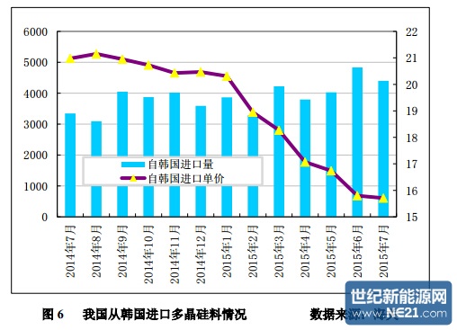 2015 年 7 月份从韩国进口多晶硅量为 4399 吨,环比减少 9.0%;7 月份进 口单价再创历史新低,微幅降至 15.71 美元/千克,环比降幅为 0.57%。 2015 年 1-7 月份累计从韩国进口多晶硅量为 28431 吨,同比增加 66.1%; 1-7 月份累计进口均价为 17.43 美元/千克,同比降幅为 17.5%。