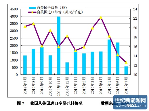 2015 年 1-7 月份累计从美国进口多晶硅量为 11472 吨,同比增幅为 1.1%; 1-7 月份进口均价为 17.23 美元/千克,同比降幅为 11.9%。