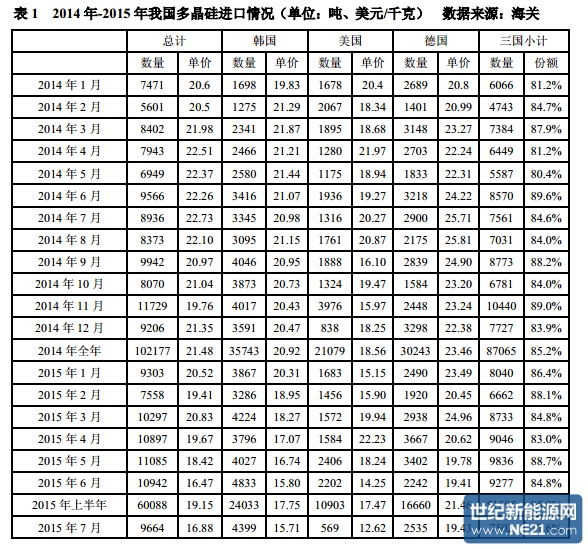 一、1-7 月份累计自韩国进口多晶硅 28431 吨,占总进口量的 40.8%,进口量同比去 年大幅增加 66.1%。韩国的主要出口企业 OCI 和韩国硅业(Hankook Silicon) 的税率仅为 2.4%和 2.8%,反倾销税对其根本不造成任何影响,故韩国在 2014 年 5 月超过美国和德国,一跃成为最大的进口来源地,已经连续一年以上保持 首位。1-7 月份自韩国通过加工贸易方式进口多晶硅 12980 吨,占自韩国进口总 量的 45.7%,虽占比不算最大,但由于其进口总量排首位,故自韩国加工贸易 进口总量比加工贸易占比最大的美国尚多出 20.7%,可见,从韩国进口无论是 总量还是加工贸易量都强烈冲击着国内多晶硅市场,因此对韩国倾销进行复审 迫在眉睫 。