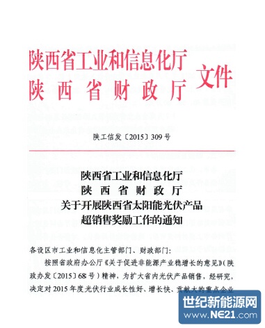 世纪新能源网(记者张思思报道)消息:日期,陕西省工业和信息化厅、陕西省财政厅向陕西省各设区市工业和信息化主管部门、财政部门:下发《关于开展陕西省太阳能光伏产品超销售奖励工作的通知》陕工信发〔2015〕309号文件。