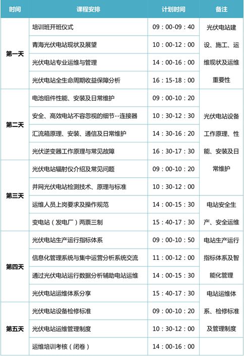 届时,培训班将邀请青海师范大学教授、顺德中山大学太阳能研究院光伏专家、乐山职业技术学院光伏发电技术专业教授、业主单位资深光伏电站运维专家、光伏电站检测技术专家及多位一线运维专家讲课并现场答疑,此外,培训班还邀请了天合光能、瑞士Multi-Contact和隆玛科技三家知名设备厂商与学员进行技术交流。培训结束后,统一颁发北京木联能软件股份有限公司“光伏电站运维培训班”证书。