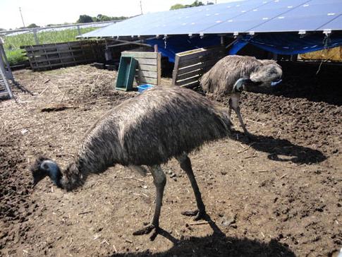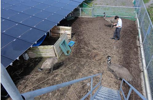为了除草,该电站中除了山羊和绵羊外,还放养着鸸鹋。鸸鹋原栖息于澳大利亚,是鸵鸟的同类,成年鸸鹋身长能达到1.6m左右。体型仅次于鸵鸟,除了在动物园中能经常见到外,因可获油和肉,还作为家畜饲养。山口县等就有鸸鹋牧场。