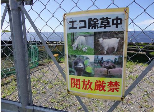 这两座发电站由在东九州经营着51座加油站等的大分石油(大分市)建设的。几乎没有杂草的原因,一到久兵卫2号发电站的入口马上就明白了:在围栏围起来的发电站内,有大鸟在电池板间漫步,啄食地面的杂草(图1)。围栏上贴有写着生态除草中,严禁开放的提示牌,贴有鸸鹋、山羊和绵羊的照片(图2)。