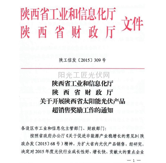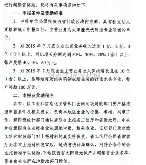 根据陕西省工信厅 陕西省财政厅《关于开展陕西省太阳能光伏产品超销售奖励工作的通知》(陕工信发〔2015〕309号)(文件附后)精神,现将我市申报有关事项通知如下: