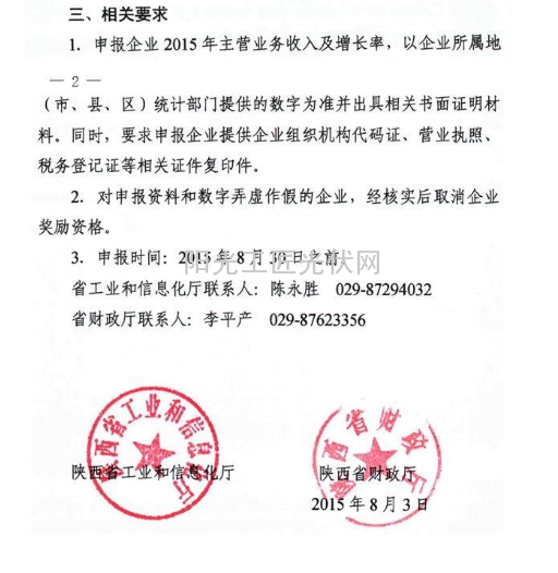 1.申报条件、资料及奖励标准按照陕工信发〔2015〕309号文件执行。