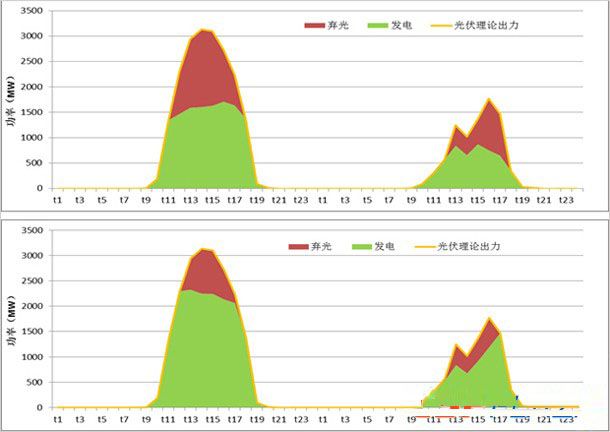 而下图为在1000万千瓦光伏+200万千瓦光热装机下,假设(400万千瓦光伏+200万千瓦)光热位于同一区域,配置不同储热时间(2h和10h)光热电站时,400万千瓦光伏电站的输出功率图。上边为配2小时储热光热电站时光伏电站的输出图,下边为配10小时储热光热电站时光伏电站的输出图。分别模拟了天气情况较好(左边曲线)和天气不太好(右边曲线)的出力情况。由此图可见,配10小时储热光热电站时,光伏弃光率明显降低。