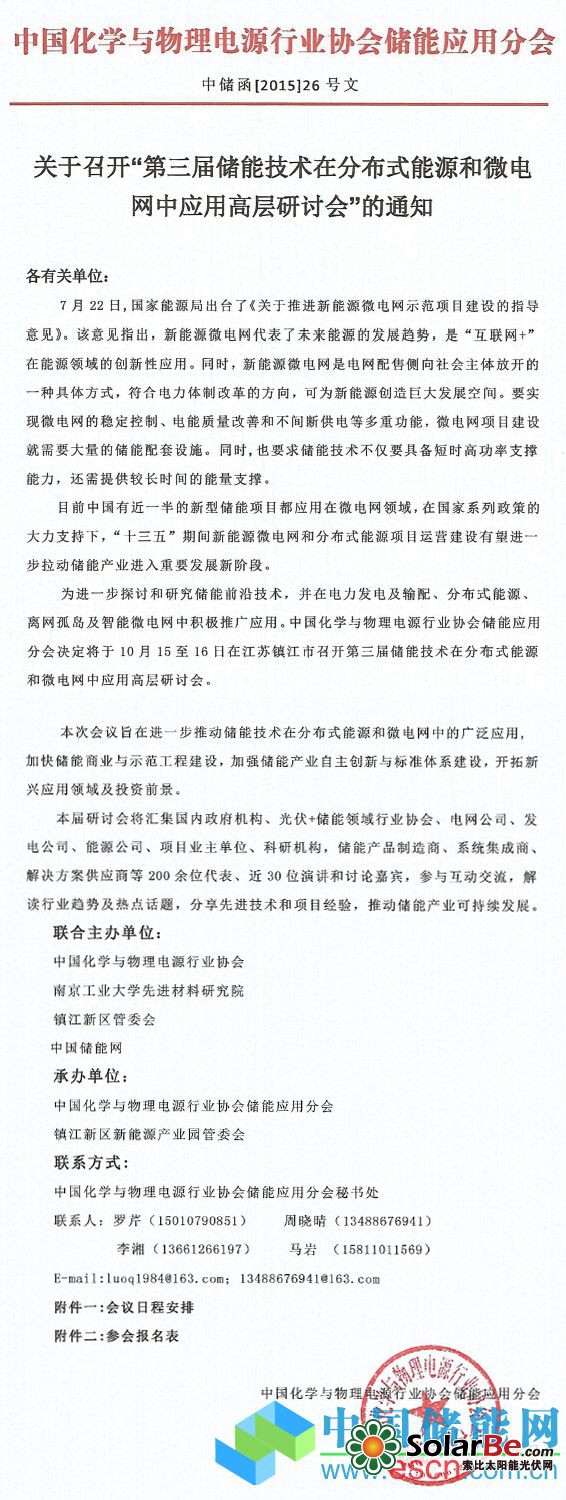 关于召开“第三届储能技术在分布式能源和微电网中应用高层研讨会”的通知