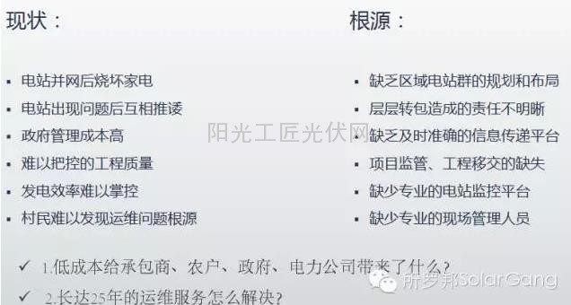“2015年3月9日,国家能源局转发了由水电水利规划设计总院的《光伏扶贫试点实施方案编制大纲(修订稿)》(下称《大纲》),此举是为持续推进、完善光伏扶贫工作进展,为各扶贫地编制光伏扶贫实施方案提供参考依据。笔者经过近期在安徽、河北、山西、重庆等实地考察和调研发现,光伏扶贫政策引导下的分布式太阳能发电市场受制于供给方(开发主体)方案的局限性和商业模式的滞后,现实版本的县级扶贫方案实施细则和传说中的能源互联网、智能电站开发管理等存在一定程度的跨距。莫让“光伏扶贫”成为“扶贫光伏”,如果没有市场需求和市场供给的匹配,光伏扶贫很有可能成为下一个“金太阳工程”。