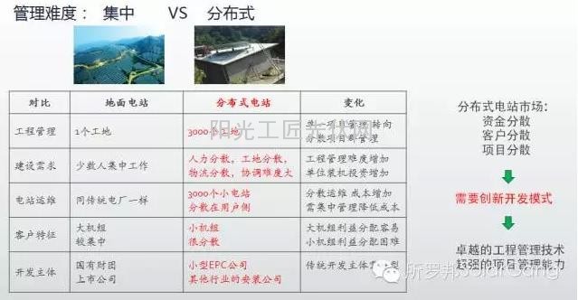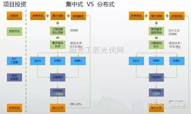 从“金太阳”到“分布式”,动了谁的奶酪?分布式能源政策通过度电补贴的方式,重在光伏电站发电效率的较量,痛在企业融资能力的提升,难在跑马圈地后的项目落实。作为重资产项目投资,出于投资风险和资金回笼的考虑,在光伏扶贫政策的指引下,纷纷安营扎寨于光照资源充足的山西、河北、甘肃等地区。资本的逐利性需要体现为光伏开发企业储备大型的地面电站、荒山荒坡电站,而小型的村级电站、居民电站却成为难以下咽的”鸡肋“。一些地方政府出台了“以大配小”的方式,捆绑以在一起,以确保光伏扶贫政策的落地。然而,从”大型地面“转战到”小型屋顶“,是B2B到B2C的转移,分布式推广呼唤商业模式的创新。所罗君闲言少叙,还是上图吧:
