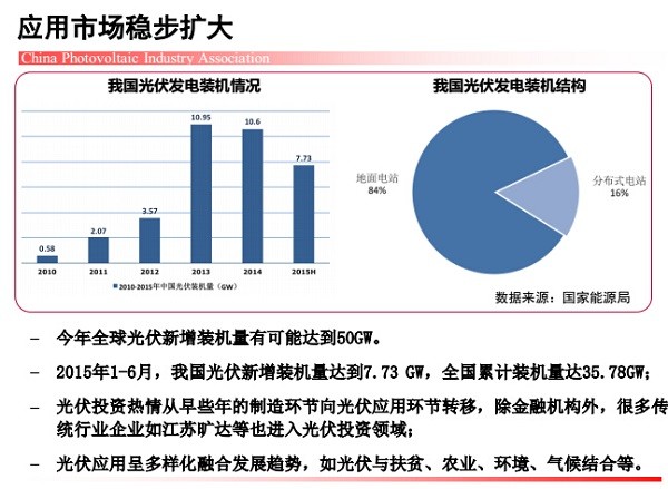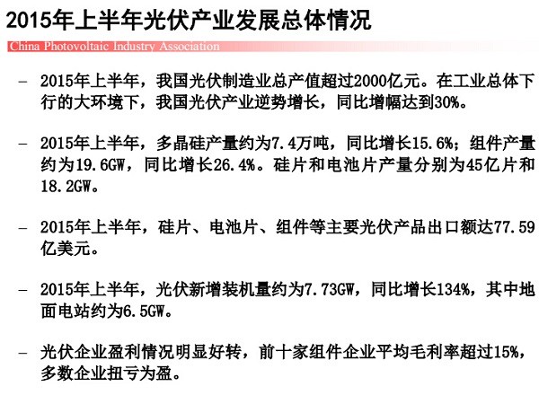 上半年我们光伏制造业总产值超过2000亿,同比增幅达到30%,多晶硅7.4万吨,增长19.6%。上半年的时候,硅片电池片等主要光伏产品出口额77.59亿美元,上半年新增装机7.73GW,毛利率都是两位数。首先应用市场稳步扩大,去年10.6GW,两年之内变成世界第一大光伏市场。当年我们两头在外的时候,我们市场不值得一提。去年和前年的时候,连续两年成为世界最大的市场。今年1-6月,新增装机7.73GW全国累计达到35.78GW。现在整个光伏产业的投资热情已经从前几年的热衷于制造环节向应用环节转移,很多光伏行业的企业都已经涉足于应用环节了,非光伏行业的企业正在积极进入光伏领域。这应该是发展现状和特点。
