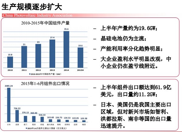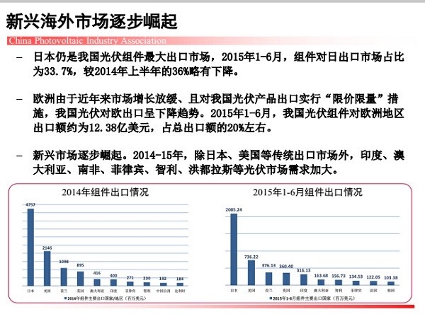 另外一个就是新兴海外市场正在逐步崛起,今年上半年连续去年的情况,日本仍然是我们光伏最大的日常,我们对日本出口33.7%,比较2014年上半年36%略有下降,但仍然是最大的市场。欧洲只占我们出口额的20%左右,我印象是18.4%,新兴市场在逐步崛起。我认为现在的国际市场已经跟前几年的市场相比发生了非常大的变化,出现了多元化发展的市场格局,而且在相当长的时间内,我们国际市场会出现东方不亮西方亮的发展格局。不像过去一样,我们产品95%以上出口,出口的市场70%以上在欧洲,欧洲里面大部分在德国,这种情况可能一去不复返了。就欧洲来讲,去年发展比较快的是荷兰、英国占的比例比较多。今年除了荷兰和英国仍然保持比较大的比例以外,法国在上半年出现了超过200%的增长。可能之前叱咤风云的光伏市场西班牙、意大利都排在后面了,德国也排在后面了。相反亚洲市场在快速增长,去年占到我们出口50%多,今年上半年超过了57%,仍然在增长,上半年拉美市场出现了将近200%的增长。光伏市场已经从发达国家向发展中国家扩散。据专家统计,光伏市场的增长,去年超过了100多个国家装机量都在增长,不光是有钱人干这个事,发展中国家在后发过程当中,经过总结前面的经验,发现应对气候变化,发展绿色能源这件事,早走也得走,晚走也得走,还不如现在直接上呢。所以发展中国家发展也是很快的。