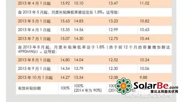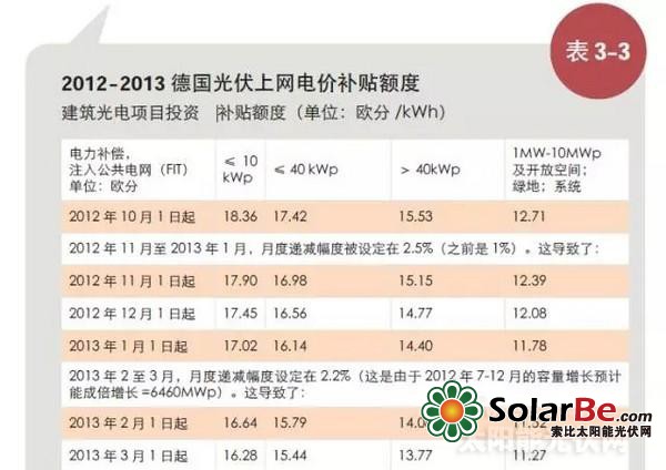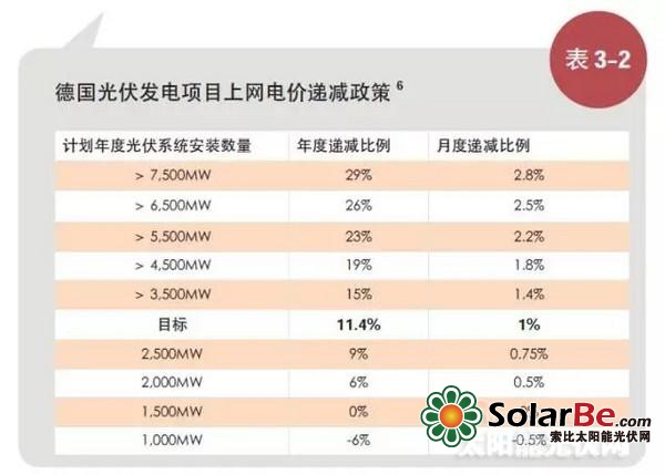 根据2012年4月生效的可再生能源法修正案,政府再次大幅削减光伏补贴,不同规模的光伏发电项目享受的上网电价将以特定比例逐月递减,每月的递减比例取决于年度光伏系统的安装数量(如表3-2所示),电价补贴采取总量控制,每年补贴2.5-3.5GW,当累计装机达到52GW时不再对新增光伏装机进行电价补贴。