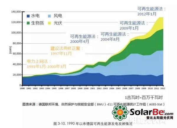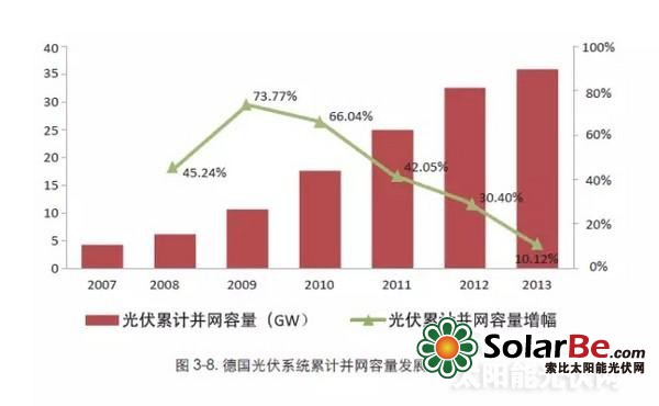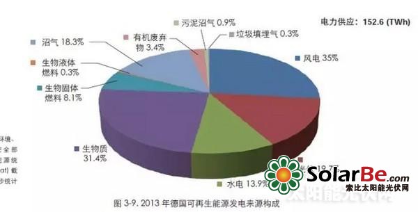 2013年,德国总发电量为6336亿千瓦时,可再生能源发电量占比23.9%,达1517亿千瓦时,消费量占比25.4%。这一结果主要源于光伏发电的迅猛增加,2013年光伏发电新增装机达到3.3GW,累计装机达到35.9GW,发电量达到359亿千瓦时,同比增加13.7%,占全国电力消费的大约5.0%,成为继风电和生物质发电之后的第三大可再生能源电力来源。德国光伏发电装机中,分布式光伏发电占比近80%。