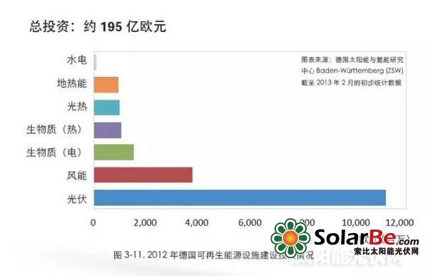 近年来,德国投入巨额资金培育可再生能源市场。2010年光伏市场的爆炸式增长使德国政府的可再生能源投资总额达到264亿欧元。此后两年,上网电价补贴的逐渐削减导致投资额有所回落。2012年,德国可再生能源投资额突破195亿欧元,光伏发电仍是主要投资方向,占总投资额的57%,支持了光伏市场的强劲增长。