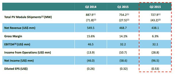 索比光伏网讯:9月8日英利公布2015年第二季度财报,当季营收达US$438.1M,发货量则达727.9MW,较前季的754.2MW小幅衰退。毛利润则是由上季的14.1%大幅下降到6.3%,让先前毛利润达20%都尚未转盈的英利,在第二季出现了2014以来最大的单季亏损,净损近一亿美金。