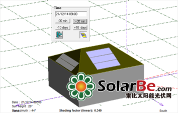 发电量预测的主要从业主角度考虑基于该设计方案下的理论发电量,本例使用PVsyst6.25模拟软件,建立如图5所示简化模型,并对该模型在冬至日9时下的阴影情况进行了分析,通过图6可知在冬至日9时,西面的阵列已经完全被遮挡,当真太阳时10点,阴影遮挡已消失,因此采用独立双MPPT跟踪是非常有必要的。