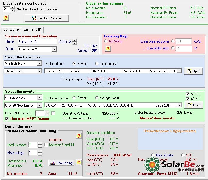 PVsyst软件中对于多路MPPT功能的具体设置参考图7,在该软件中,如果需要将2种不同朝向的组串接入组串逆变器并使用双路MPPT功能,则每一路输入组串所对应的方阵需事先定义为“Sub-array”,比如“Sub-array 1#”为正南向组串,“Sub-array 2#”为正西向组串。