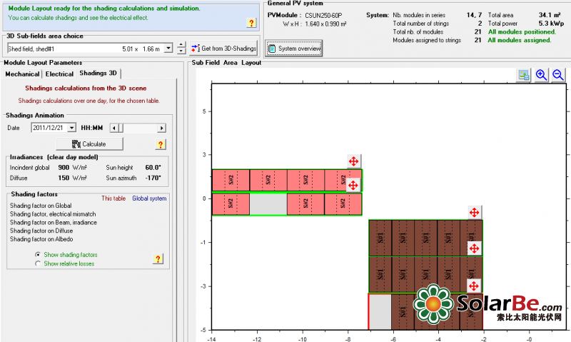 为了解决PVsyst东西面气象数据和实际情况不符的疑问,继续通过Ecotect专业软件分析验证,如图1所示,结果表明,正西面接收的太阳辐照量要比正东面大些,它这里面考虑的一个因素为下午的空气密度一般比上午要小,而如果不考虑空气密度的影响,这两个方位角所受的辐射量应该是比较接近的,所以对于该项目,组件理想的敷设位置优先考虑正南面和正西面,确定安装朝向后下一步就是组串布置等设计。