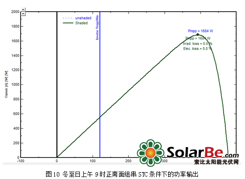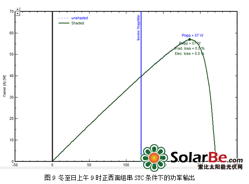图8为“Layout”界面,目的是给组件之间进行电气连接,比如被赋予粉色的组件对应为“Sub-array 2#”,棕色组件串为“Sub-array 1#”,完成组件的电气连接后,我们可以进行I-V曲线的模拟,还可以验证两路MPPT是否发挥作用,如图9和图10所示分别对应为冬至日上午9时西面阵列和正南面阵列的实时P-V输出曲线,最大功率分别为57W和1684W,可见正南面组串并没有受到正西面组串遮挡的影响。