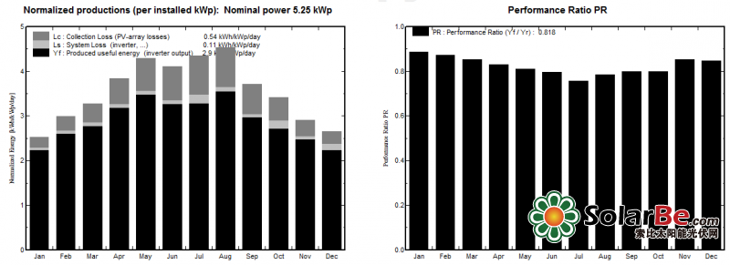 通过以上近场阴影建模和系统配置,通过PVsyst可模拟得到系统首年各月份的PRstc值及日有效发电小时数,其中首年理论系统效率PRstc为81 %左右,参看图11。